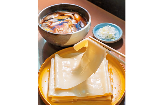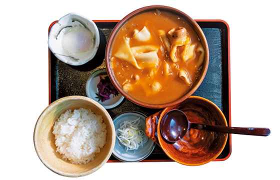 一般的なひもかわよりも幅広く、15cmほどとインパクト大の自家製麺が人気なのがこちら。温かいつけ汁と冷たい麺を合わせる肉なすつけ汁ひもかわ1220円(写真1枚目)、小ライスや温泉卵、おしんこ付きのカレーひもかわセット(写真2枚目)1350円が人気です。