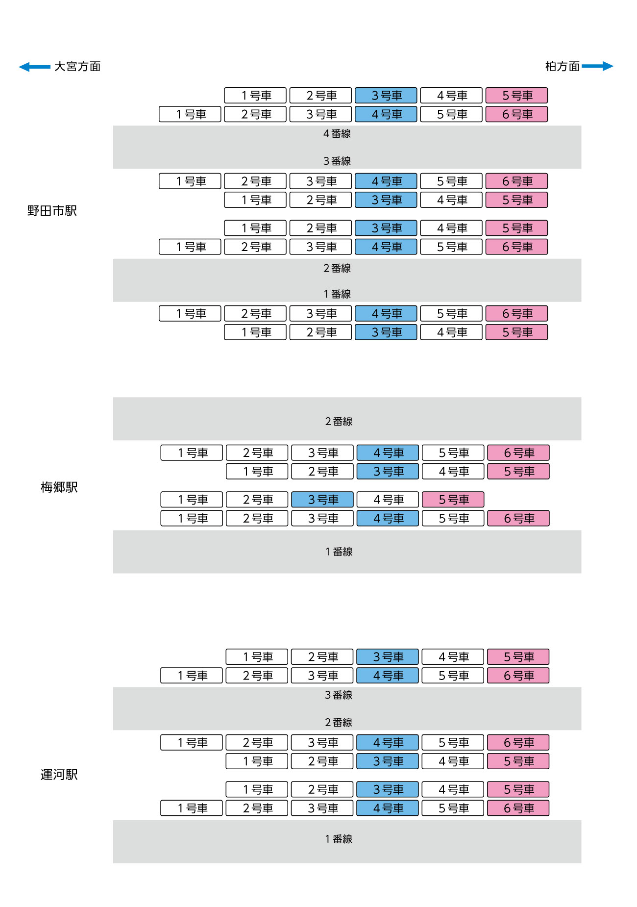 2025年02月06日東武アーバンパークライン5両編成運転のお知らせ 各5両編成停車位置 大宮~春日部間 春日部~野田市間 野田市~柏間 柏~船橋間 大宮~春日部間 春日部~野田市間 野田市~柏間 柏~船橋間 一覧へ戻る