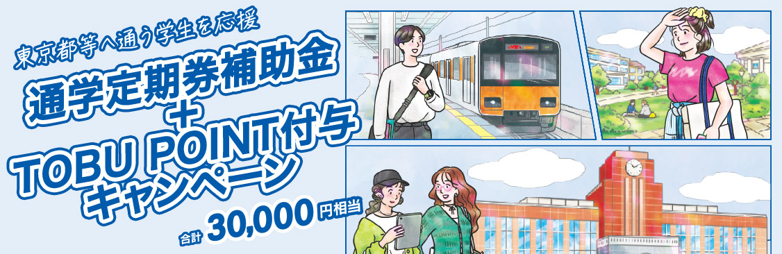 - ※4月1日以前から開始の定期券をお持ちの場合は、邑楽町の支援金交付決定に基づき通学支援 TOBU POINT 10,000pt付与キャンペーンの対象となる場合があります。
