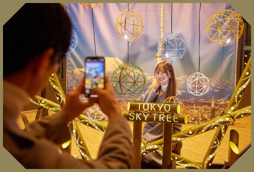 - 世界一高い電波塔である東京スカイツリーの展望台で空中散歩をお楽しみいただいたお客様に、お帰りの際も満足いただけるよう出口に竹あかりのオブジェを設置します。幻想的な竹あかりのオブジェがお客様をお見送りします。